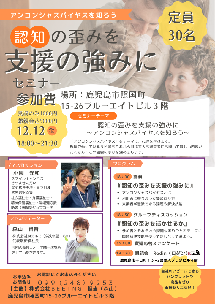 12月12日(金) 鹿児島市にて「認知のゆがみを支援の強みにーアンコンシャスバイアスを知ろう」をテーマにした支援者向けセミナーにスマイルキャンパス代表の小園洋和が、ディスカッションパートに登壇します。